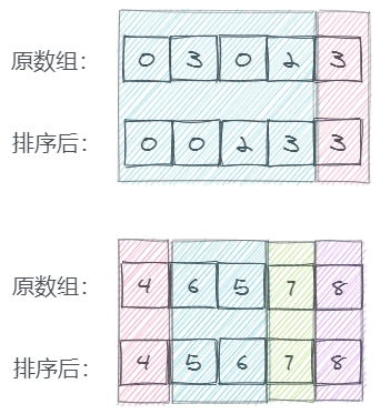 也就是原数组进行分块后,每一个分块和排序后的数组中对应的分块数字是一样的,只是排序不同。