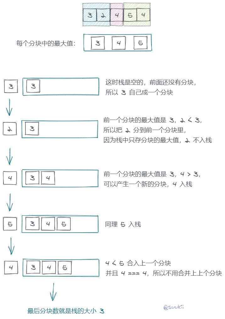 如果数字小于之前某些分块的最大值,那这些分块都要被合成一个分块(保持栈的单调递增)。