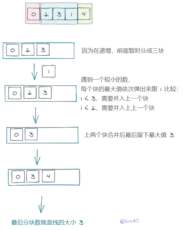 在遍历数组的过程中,如果一个数字比之前所有分块的最大值都要大,我们就把它作为一个新的分块。