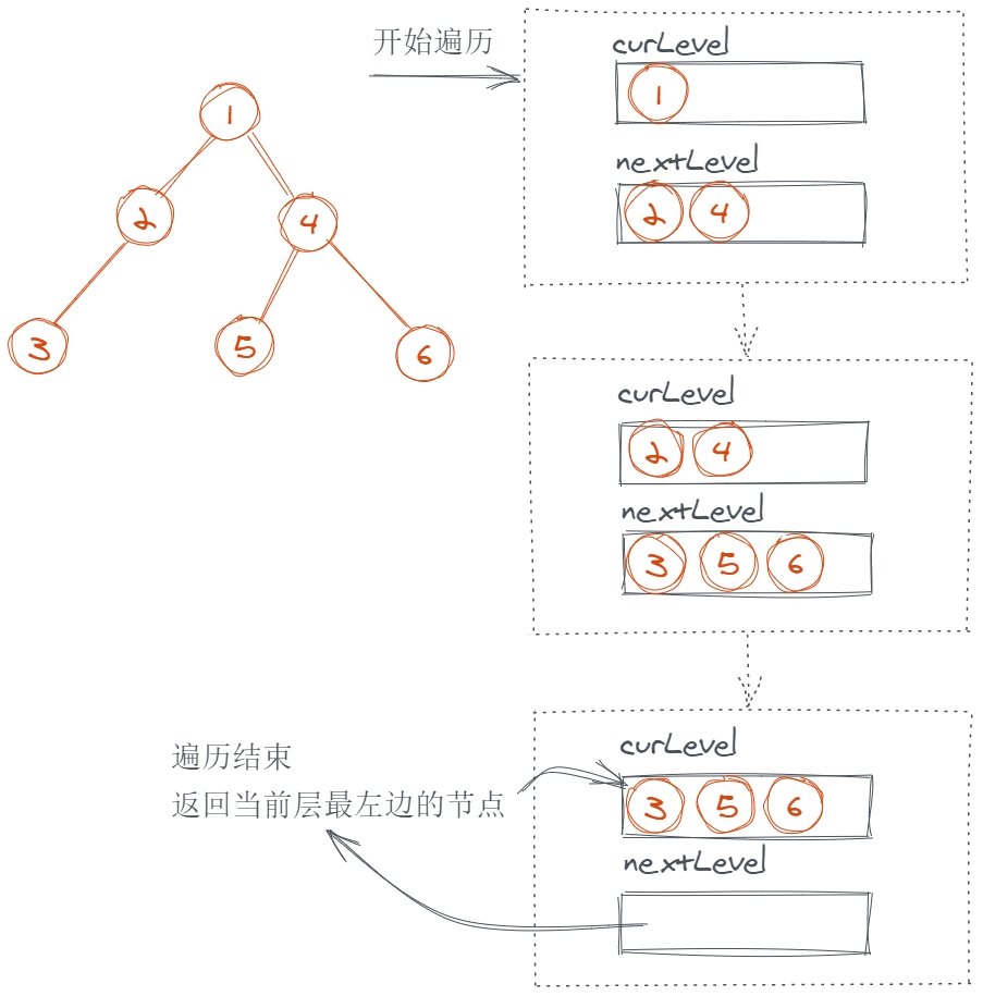 如果没有,说明已经遍历到树的最深层次,此时 curLevel 中放的是最深层的所有叶子节点,返回第一个即可;