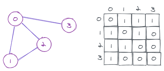 由于这是一个无向图,所以 (0, 2) 表示 (2, 0) 也是存在的,也就是 matrix[0][2] 和 matrix[2][0] 都是 1。